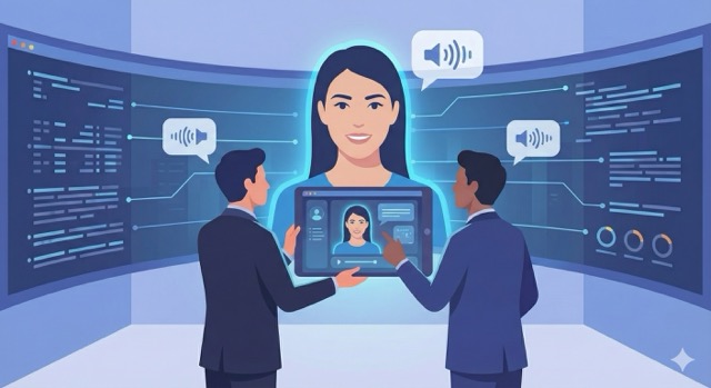 WebRTCを活用して、壁面にデジタルヒューマンを投影し、タブレットのマイクを経由した音声会話を実現